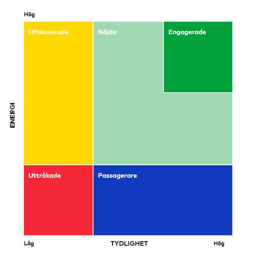 Vi mäter engagemang med vad vi kallar ett engagemangsindex som består av åtta frågor uppdelade på två områden: 1) energi (gäller både känslomässig och organisationsinriktat engagemang) och 2) tydlighet.