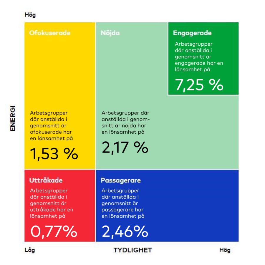 Varje enhet, det kan vara en organisation, en affärsenhet, en arbetsgrupp eller en enskild medarbetare, kan ritas in i diagrammet. Vi har tittar närmare på vår data och gjort en studie där energi och tydlighet kopplades till lönsamhet. Studien visar att organisationer där genomsnittet för båda områdena var högt för samtliga anställda (de mörkgröna områdena) var de organisationer som hade högst lönsamhet. Organisationer med nöjda medarbetare (ljusgröna områden) hade lägre lönsamhet. Organisationer med högst andel passagerare (blått) och uttråkade medarbetare (gult) hade ännu lägre lönsamhet. Den här studien visar hur engagemang är kopplat till en organisations ekonomiska resultat.