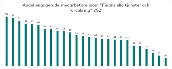 Men även inom finans- och försäkringsbranschen skiljer engagemanget såklart mellan organisationer. När vi tittar på datan från 2021 hur engagemanget såg ut fanns ett spann mellan 55% till 30% engagerade medarbetare.