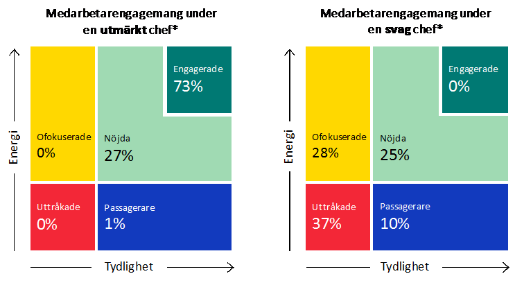 Om vi tittar på engagemangsmatrisen nedan så ser vi att utmärkta chefer lyckas engagera 3 av 4 medarbetare, och har i princip inga oengagerade medarbetare. Och hos chefer som har ett svagt ledarskap är situationen den omvända.