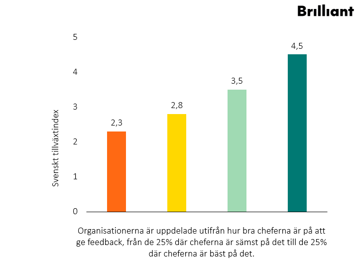 Att jobba med feedback är viktigt. I Brilliants studier kan vi se att de som är duktiga på feedback är också mer lönsamma och har högre tillväxt. Chefer som ger regelbunden feedback till sina medarbetare har högre tillväxt.