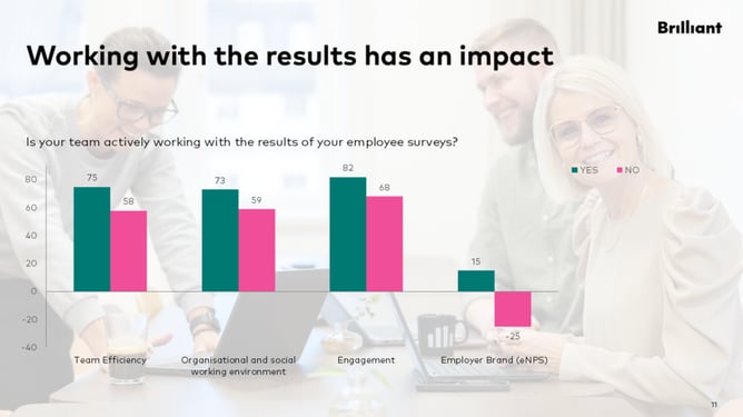 A key factor in creating impact is understanding results on multiple levels at the same time. With Brilliant’s platform, organisations gain insights for teams, managers, leadership teams and the organisation as a whole – supported by strong anonymity protection that encourages employees to respond honestly.