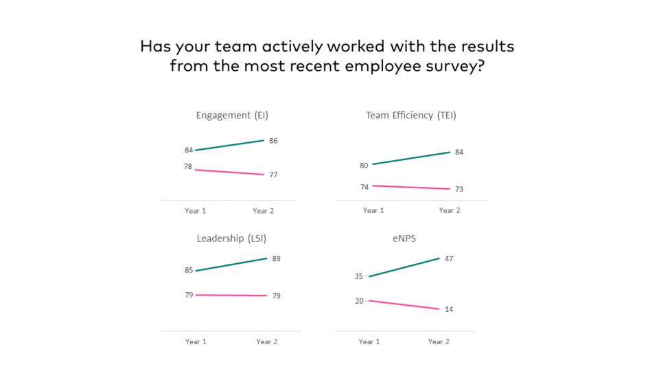 We studied 90 different workgroups. The study clearly shows a difference in Engagement Index, Team Effectiveness, Leadership Index, and eNPS among groups that have actively worked with the results from their latest employee survey. In other words – acting on the results will have an impact.