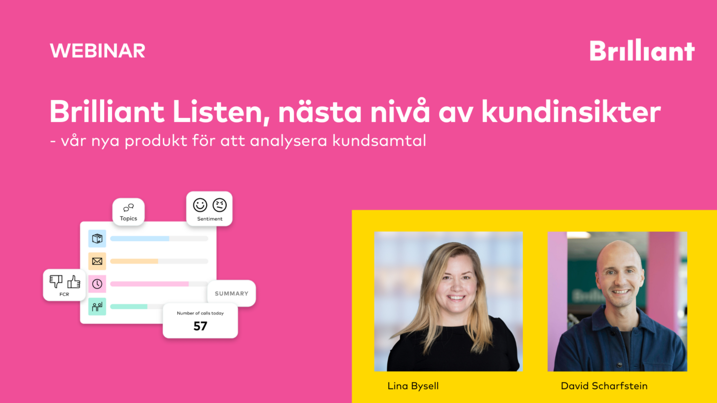 Välkommen till ett webinar där vi introducerar Brilliant Listen, vår helt nya produkt för konversationsanalys. Det hjälper er att förstå era kundmöten djupare med analys av inspelade samtal